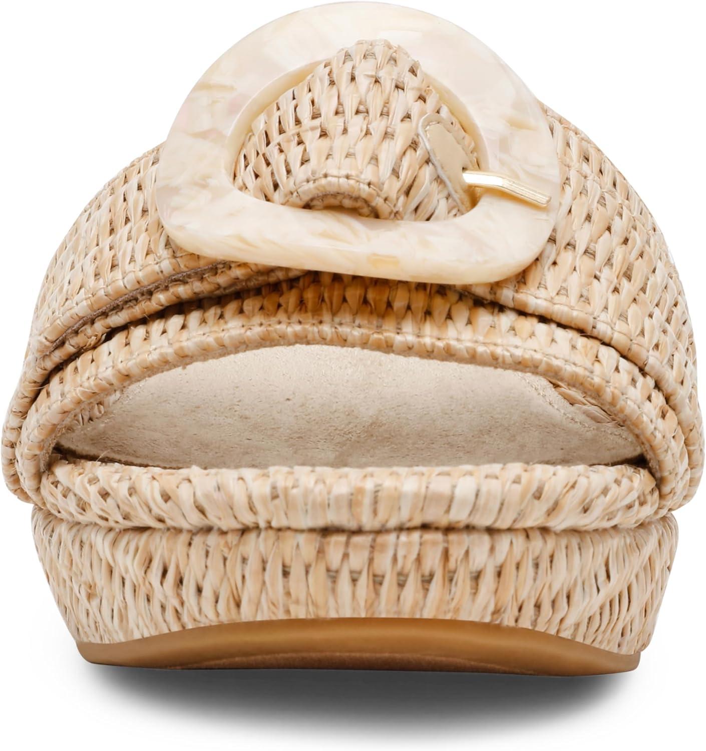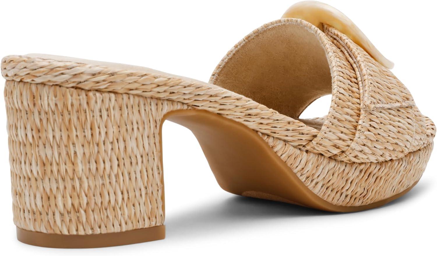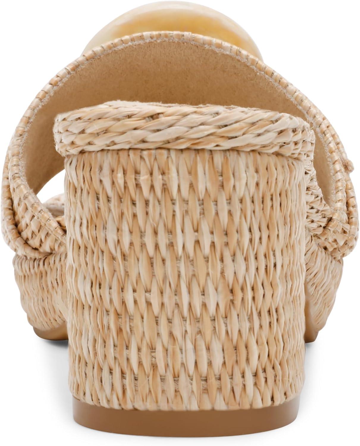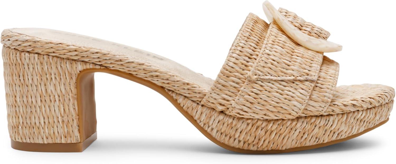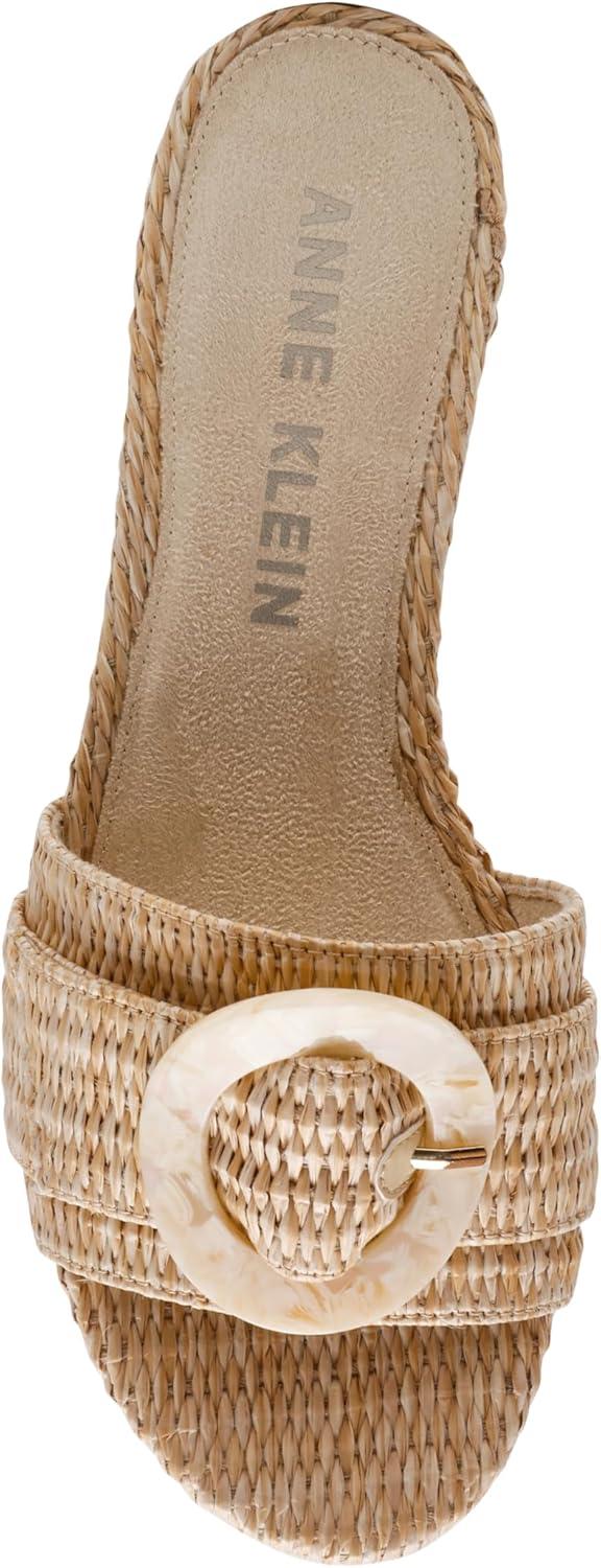 Bring a relaxed yet refined touch to your wardrobe with the Anne Klein Pepper sandal. This slip-on design features a chic block heel, a tonal buckle, and a stylish raffia upper, offering the perfect combination of comfort and elegance.