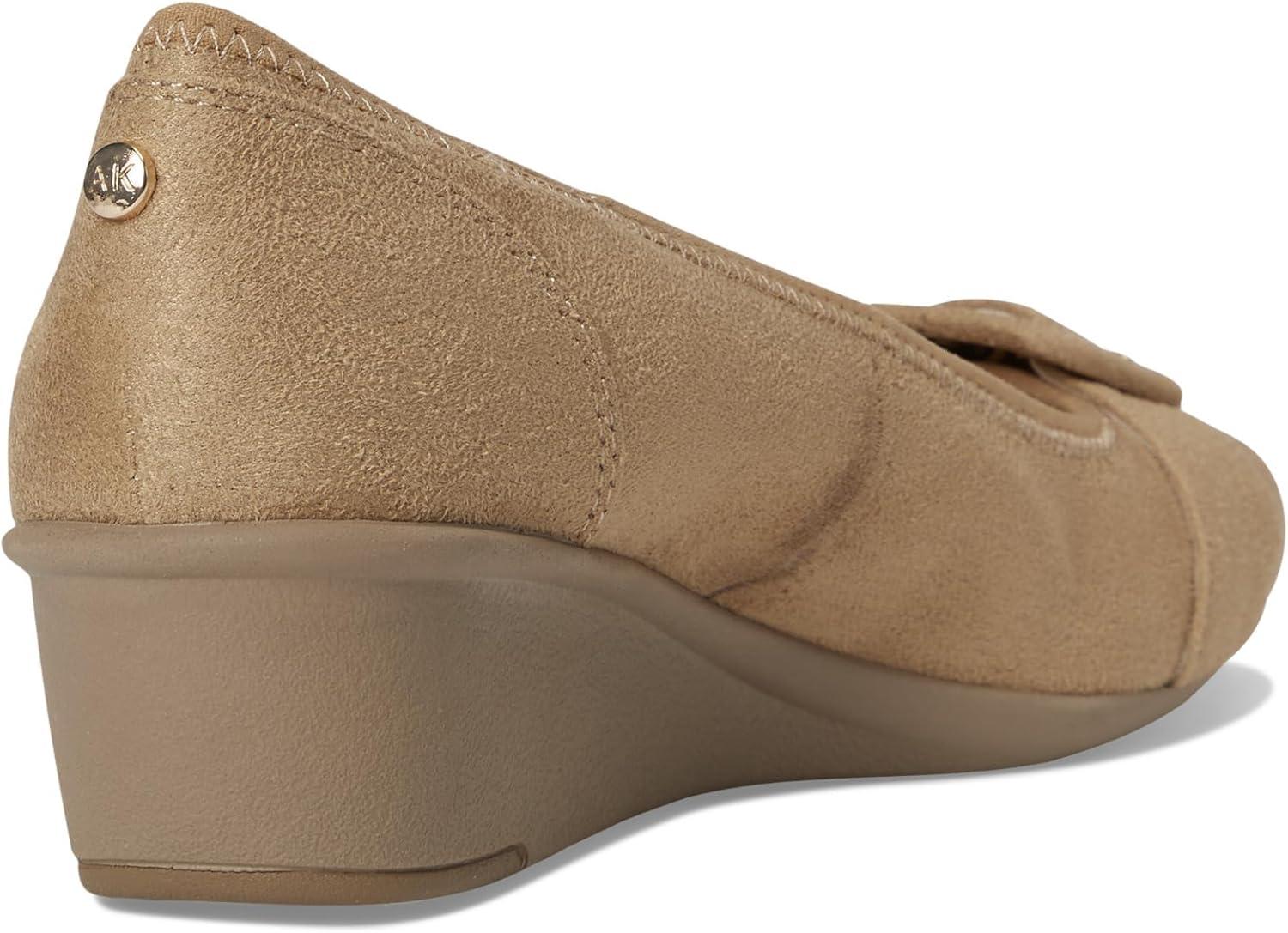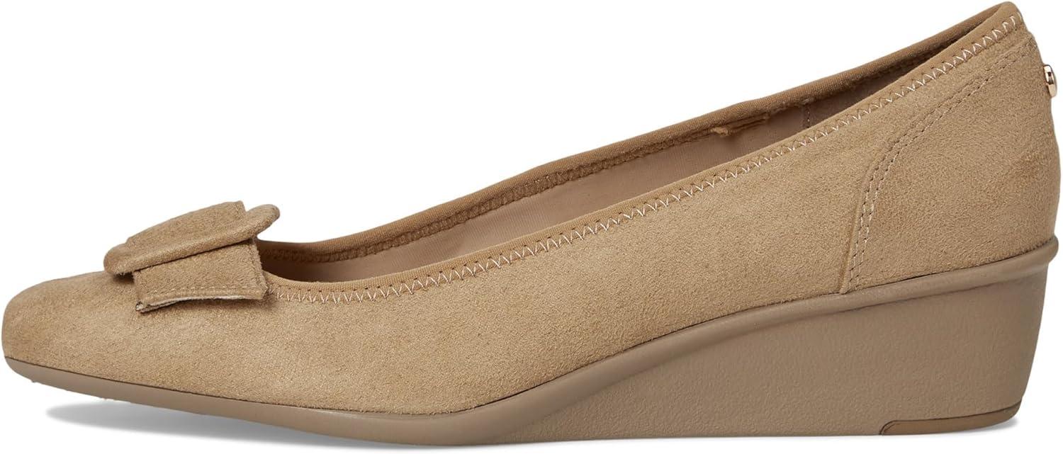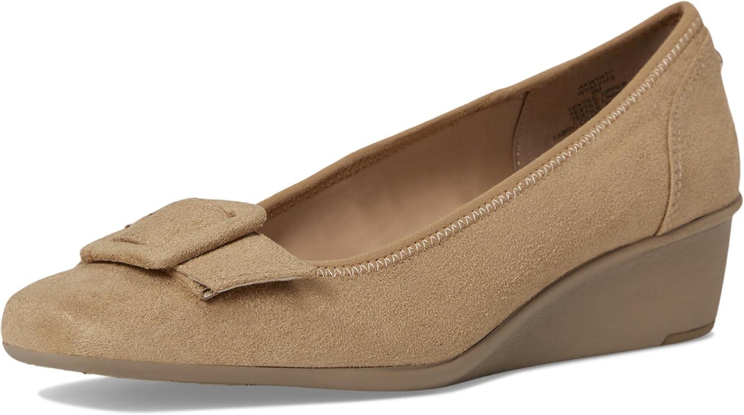 Pointed-toe wedge pump featuring patent-texture heel counter and padded sport insole; Rubber traction outsole